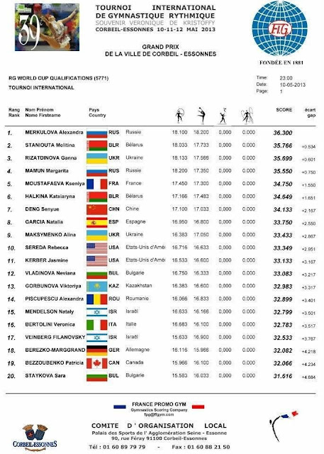 Após o primeiro dia de competições, Alexandra Merkulova encerra em primeiro lugar com o somatório de 36.300, seguida por Staniouta (35.766), Rizatdinova (35,566) e Mamun (35,550) abaixo vídeos, resultados e links.